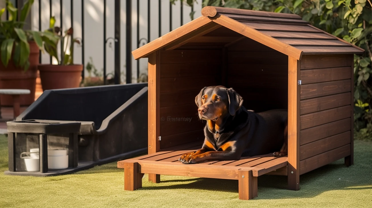 Kluczowe wnioski:- Buda drewniana z tarasem zapewnia psu schronienie przed wiatrem i deszczem.